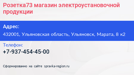 Розетка73, магазин электроустановочной продукции по адресу 432001, Ульяновская область, Ульяновск, Марата, 8 к2 в дальнейшем Организация, размещена в следующих категориях: