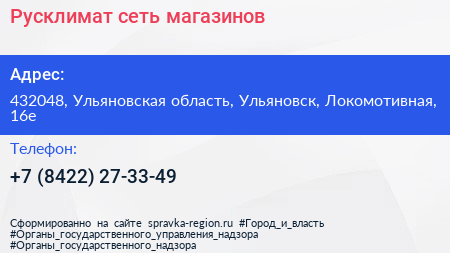 Русклимат, сеть магазинов по адресу 432048, Ульяновская область, Ульяновск, Локомотивная, 16е в дальнейшем Организация, размещена в следующих категориях: