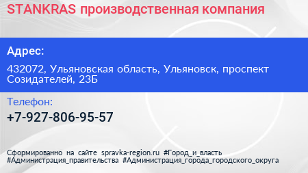 STANKRAS, производственная компания по адресу 432072, Ульяновская область, Ульяновск, проспект Созидателей, 23Б в дальнейшем Организация, размещена в следующих категориях: