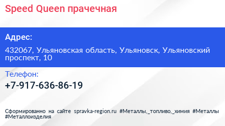 Speed Queen, прачечная по адресу 432067, Ульяновская область, Ульяновск, Ульяновский проспект, 10 в дальнейшем Организация, размещена в следующих категориях:
