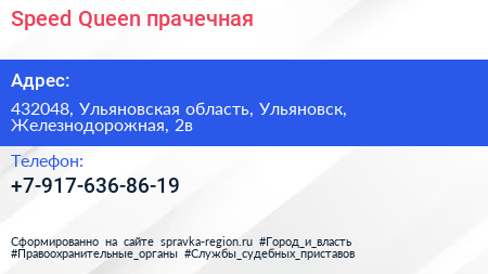 Speed Queen, прачечная по адресу 432048, Ульяновская область, Ульяновск, Железнодорожная, 2в в дальнейшем Организация, размещена в следующих категориях: