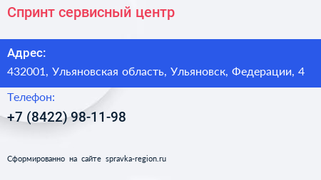 Спринт, сервисный центр по адресу 432001, Ульяновская область, Ульяновск, Федерации, 4 в дальнейшем Организация, размещена в следующих категориях:
