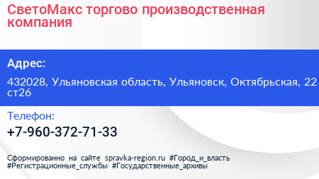 СветоМакс, торгово-производственная компания по адресу 432028, Ульяновская область, Ульяновск, Октябрьская, 22 ст26 в дальнейшем Организация, размещена в следующих категориях: