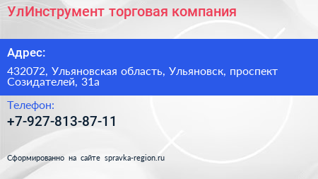 УлИнструмент, торговая компания по адресу 432072, Ульяновская область, Ульяновск, проспект Созидателей, 31а в дальнейшем Организация, размещена в следующих категориях: