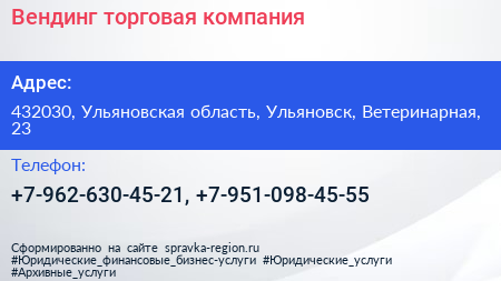 Вендинг, торговая компания по адресу 432030, Ульяновская область, Ульяновск, Ветеринарная, 23 в дальнейшем Организация, размещена в следующих категориях: