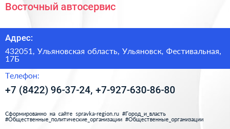 Восточный, автосервис по адресу 432051, Ульяновская область, Ульяновск, Фестивальная, 17Б в дальнейшем Организация, размещена в следующих категориях: