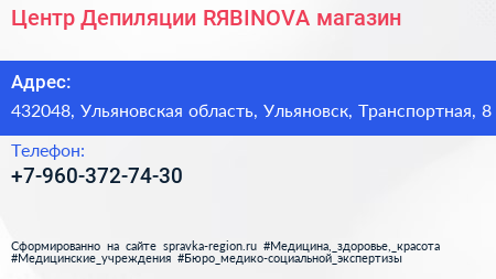 Центр Депиляции RЯBINOVA, магазин по адресу 432048, Ульяновская область, Ульяновск, Транспортная, 8 в дальнейшем Организация, размещена в следующих категориях: