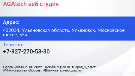 AGAtech, веб-студия по адресу 432034, Ульяновская область, Ульяновск, Московское шоссе, 55а в дальнейшем Организация, размещена в следующих категориях: