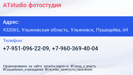ATstudio, фотостудия по адресу 432061, Ульяновская область, Ульяновск, Пушкарёва, 64 в дальнейшем Организация, размещена в следующих категориях: