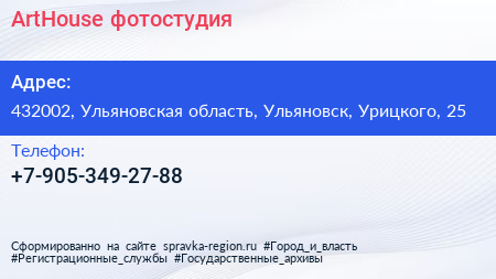 ArtHouse, фотостудия по адресу 432002, Ульяновская область, Ульяновск, Урицкого, 25 в дальнейшем Организация, размещена в следующих категориях: