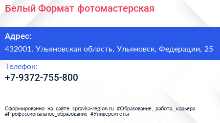 Белый Формат, фотомастерская по адресу 432001, Ульяновская область, Ульяновск, Федерации, 25 в дальнейшем Организация, размещена в следующих категориях: