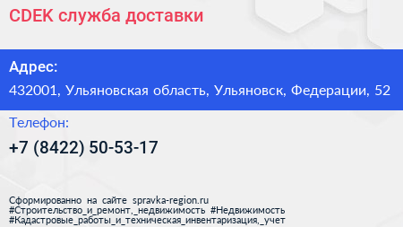 CDEK, служба доставки по адресу 432001, Ульяновская область, Ульяновск, Федерации, 52 в дальнейшем Организация, размещена в следующих категориях: