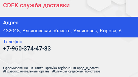 CDEK, служба доставки по адресу 432048, Ульяновская область, Ульяновск, Кирова, 6 в дальнейшем Организация, размещена в следующих категориях:
