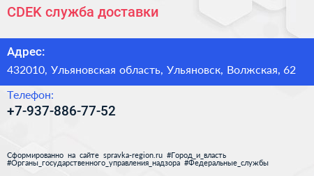 CDEK, служба доставки по адресу 432010, Ульяновская область, Ульяновск, Волжская, 62 в дальнейшем Организация, размещена в следующих категориях:
