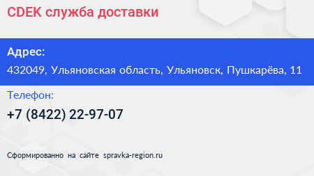 CDEK, служба доставки по адресу 432049, Ульяновская область, Ульяновск, Пушкарёва, 11 в дальнейшем Организация, размещена в следующих категориях:
