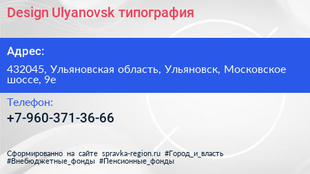 Design Ulyanovsk, типография по адресу 432045, Ульяновская область, Ульяновск, Московское шоссе, 9е в дальнейшем Организация, размещена в следующих категориях: