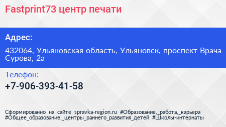 Fastprint73, центр печати по адресу 432064, Ульяновская область, Ульяновск, проспект Врача Сурова, 2а в дальнейшем Организация, размещена в следующих категориях: