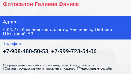 Фотосалон Галиева Фаниса по адресу 432027, Ульяновская область, Ульяновск, Любови Шевцовой, 53 в дальнейшем Организация, размещена в следующих категориях: