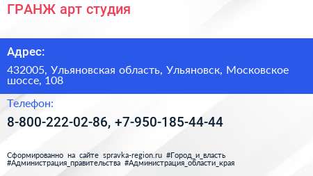 ГРАНЖ, арт-студия по адресу 432005, Ульяновская область, Ульяновск, Московское шоссе, 108 в дальнейшем Организация, размещена в следующих категориях:
