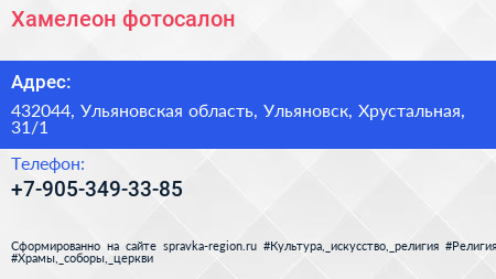 Хамелеон, фотосалон по адресу 432044, Ульяновская область, Ульяновск, Хрустальная, 31/1 в дальнейшем Организация, размещена в следующих категориях: