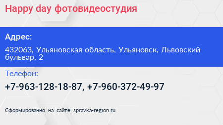 Happy day, фотовидеостудия по адресу 432063, Ульяновская область, Ульяновск, Львовский бульвар, 2 в дальнейшем Организация, размещена в следующих категориях: