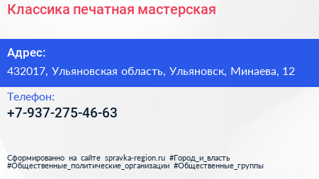 Классика, печатная мастерская по адресу 432017, Ульяновская область, Ульяновск, Минаева, 12 в дальнейшем Организация, размещена в следующих категориях:
