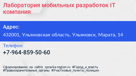 Лаборатория мобильных разработок, IT-компания по адресу 432001, Ульяновская область, Ульяновск, Марата, 14 в дальнейшем Организация, размещена в следующих категориях: