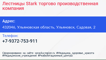 Лестницы Stark, торгово-производственная компания по адресу 432046, Ульяновская область, Ульяновск, Садовая, 2 в дальнейшем Организация, размещена в следующих категориях: