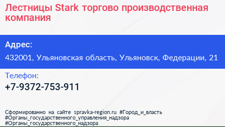 Лестницы Stark, торгово-производственная компания по адресу 432001, Ульяновская область, Ульяновск, Федерации, 21 в дальнейшем Организация, размещена в следующих категориях: