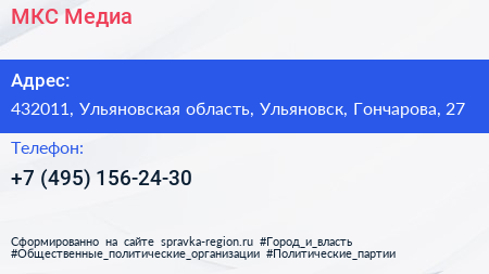 МКС Медиа по адресу 432011, Ульяновская область, Ульяновск, Гончарова, 27 в дальнейшем Организация, размещена в следующих категориях: