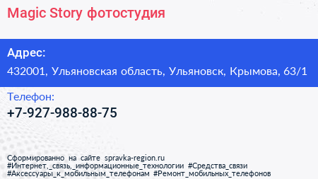 Magic Story, фотостудия по адресу 432001, Ульяновская область, Ульяновск, Крымова, 63/1 в дальнейшем Организация, размещена в следующих категориях: