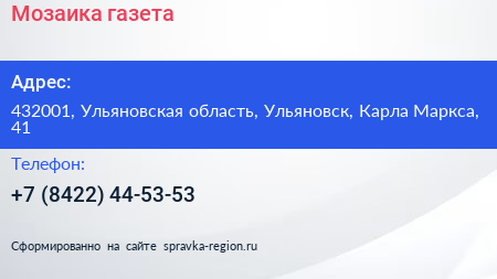 Мозаика, газета по адресу 432001, Ульяновская область, Ульяновск, Карла Маркса, 41 в дальнейшем Организация, размещена в следующих категориях: