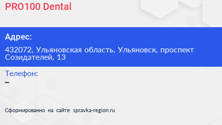 PRO100 Dental по адресу 432072, Ульяновская область, Ульяновск, проспект Созидателей, 13 в дальнейшем Организация, размещена в следующих категориях: