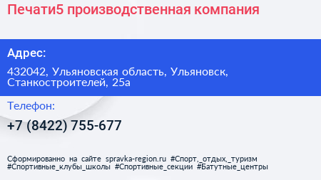 Печати5, производственная компания по адресу 432042, Ульяновская область, Ульяновск, Станкостроителей, 25а в дальнейшем Организация, размещена в следующих категориях: