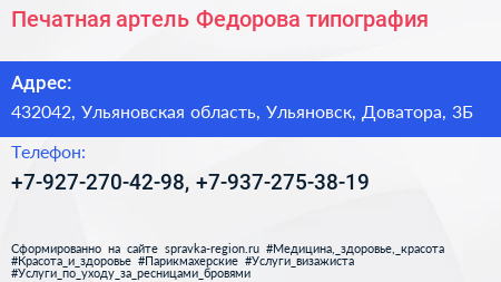 Печатная артель Федорова, типография по адресу 432042, Ульяновская область, Ульяновск, Доватора, 3Б в дальнейшем Организация, размещена в следующих категориях: