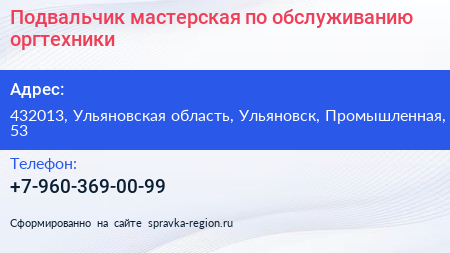 Подвальчик, мастерская по обслуживанию оргтехники по адресу 432013, Ульяновская область, Ульяновск, Промышленная, 53 в дальнейшем Организация, размещена в следующих категориях: