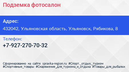 Подземка, фотосалон по адресу 432042, Ульяновская область, Ульяновск, Рябикова, 8 в дальнейшем Организация, размещена в следующих категориях: