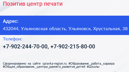 Позитив, центр печати по адресу 432044, Ульяновская область, Ульяновск, Хрустальная, 38 в дальнейшем Организация, размещена в следующих категориях: