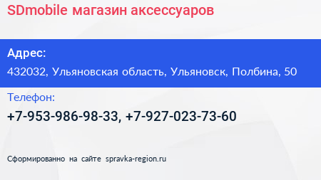 SDmobile, магазин аксессуаров по адресу 432032, Ульяновская область, Ульяновск, Полбина, 50 в дальнейшем Организация, размещена в следующих категориях:
