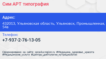 Сим-АРТ, типография по адресу 432013, Ульяновская область, Ульяновск, Промышленная, 54в в дальнейшем Организация, размещена в следующих категориях: