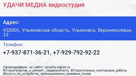 УДАЧИ МЕДИА, видеостудия по адресу 432001, Ульяновская область, Ульяновск, Верхнеполевая, 12 в дальнейшем Организация, размещена в следующих категориях: