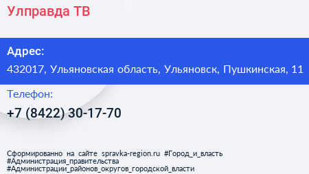 Улправда ТВ по адресу 432017, Ульяновская область, Ульяновск, Пушкинская, 11 в дальнейшем Организация, размещена в следующих категориях: