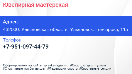 Ювелирная мастерская по адресу 432000, Ульяновская область, Ульяновск, Гончарова, 11а в дальнейшем Организация, размещена в следующих категориях: