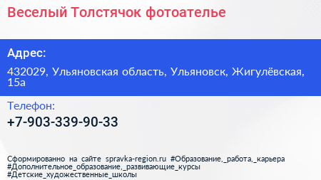 Веселый Толстячок, фотоателье по адресу 432029, Ульяновская область, Ульяновск, Жигулёвская, 15а в дальнейшем Организация, размещена в следующих категориях: