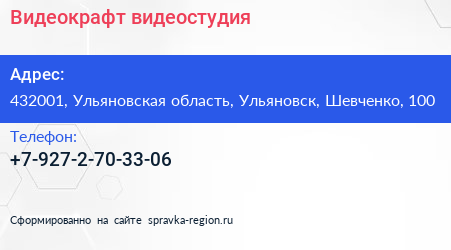 Видеокрафт, видеостудия по адресу 432001, Ульяновская область, Ульяновск, Шевченко, 100 в дальнейшем Организация, размещена в следующих категориях: