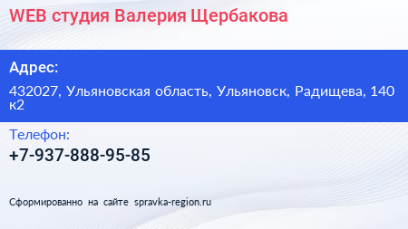 WEB-студия Валерия Щербакова по адресу 432027, Ульяновская область, Ульяновск, Радищева, 140 к2 в дальнейшем Организация, размещена в следующих категориях: