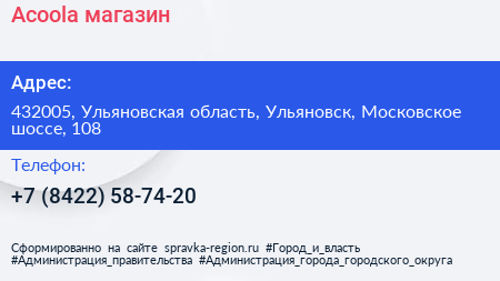 Acoola, магазин по адресу 432005, Ульяновская область, Ульяновск, Московское шоссе, 108 в дальнейшем Организация, размещена в следующих категориях: