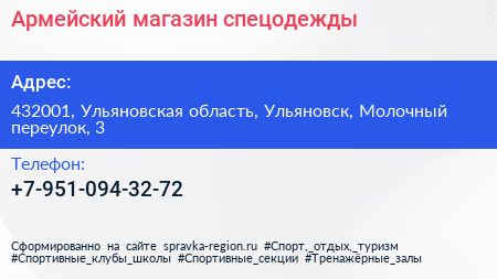 Армейский, магазин спецодежды по адресу 432001, Ульяновская область, Ульяновск, Молочный переулок, 3 в дальнейшем Организация, размещена в следующих категориях:
