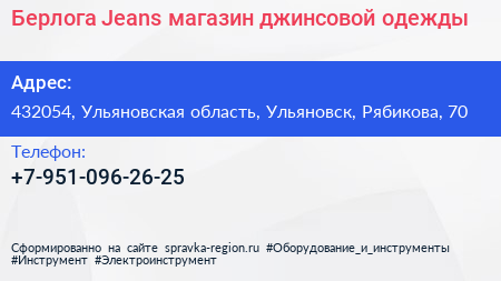 Берлога Jeans, магазин джинсовой одежды по адресу 432054, Ульяновская область, Ульяновск, Рябикова, 70 в дальнейшем Организация, размещена в следующих категориях: