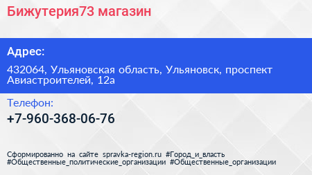Бижутерия73, магазин по адресу 432064, Ульяновская область, Ульяновск, проспект Авиастроителей, 12а в дальнейшем Организация, размещена в следующих категориях: